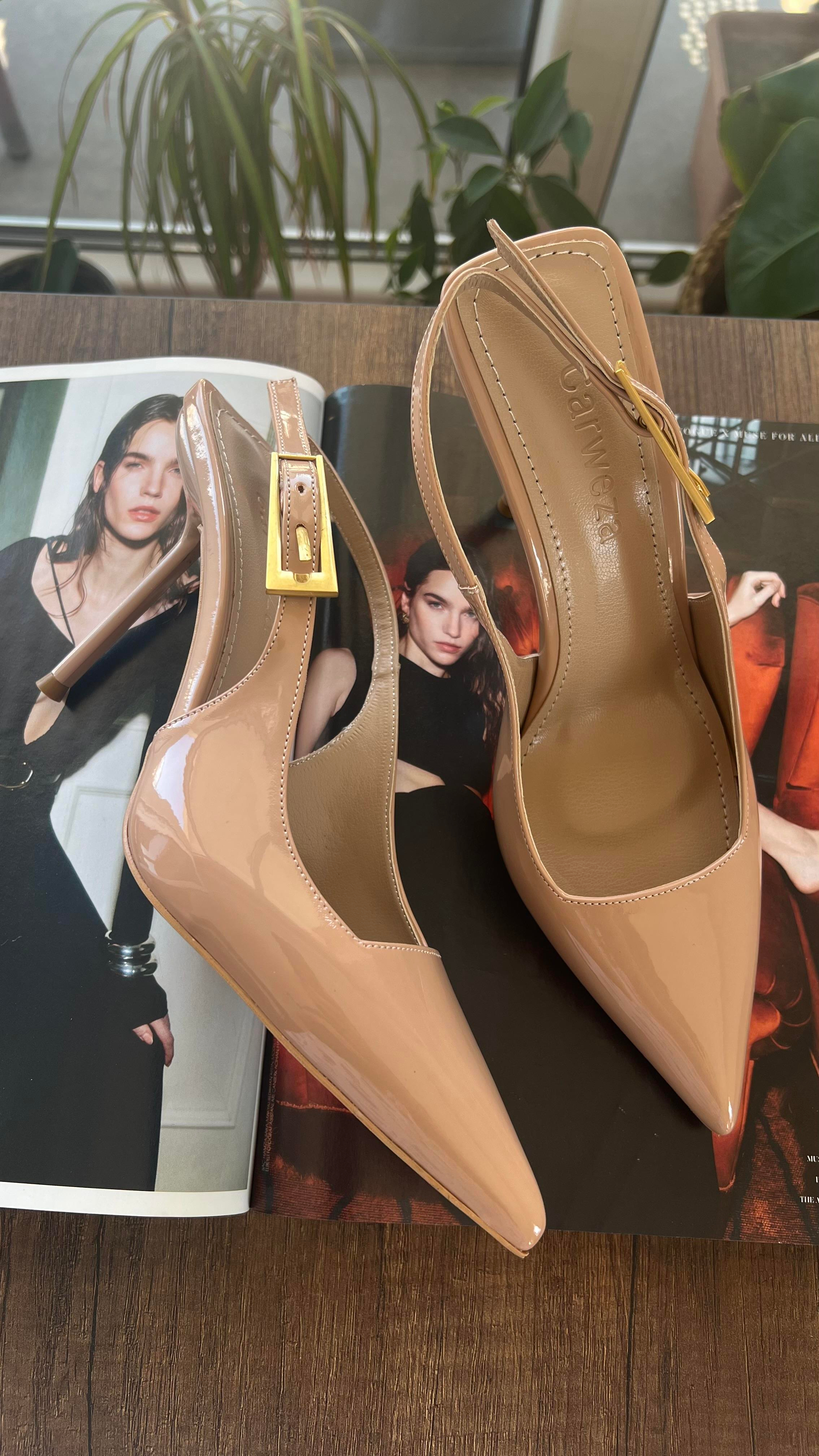 Dolce Bej rugan arkası açık metal tokalı 10 cm ince topuk tam kalıp çok rahat. El işçiliği ile üretilmiştir.